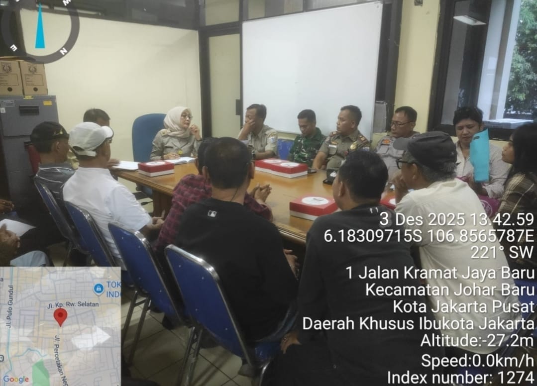 Rapat dipimpin oleh Lurah Johar Baru, Ibu Dewi Roozana Zulkifli, dan dihadiri oleh sekel, kasikesra, kasipem, Bhabinkamtibmas, Babinsa, Kasatpol PP, ketua RW 01 s/d 11, Yayasan Bunda Suci, mandor, LMK, FKDM, serta warga setempat.