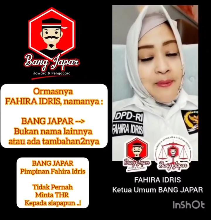 Fahira Idris menegaskan bahwa organisasi bernama “Bang Japar Indonesia” bukanlah organisasi yang ia dirikan maupun pimpin. Oleh karena itu, segala bentuk proposal, surat, maupun permintaan Tunjangan Hari Raya (THR) yang mengatasnamakan organisasi tersebut tidak ada kaitannya dengan Ormas BANG JAPAR.
