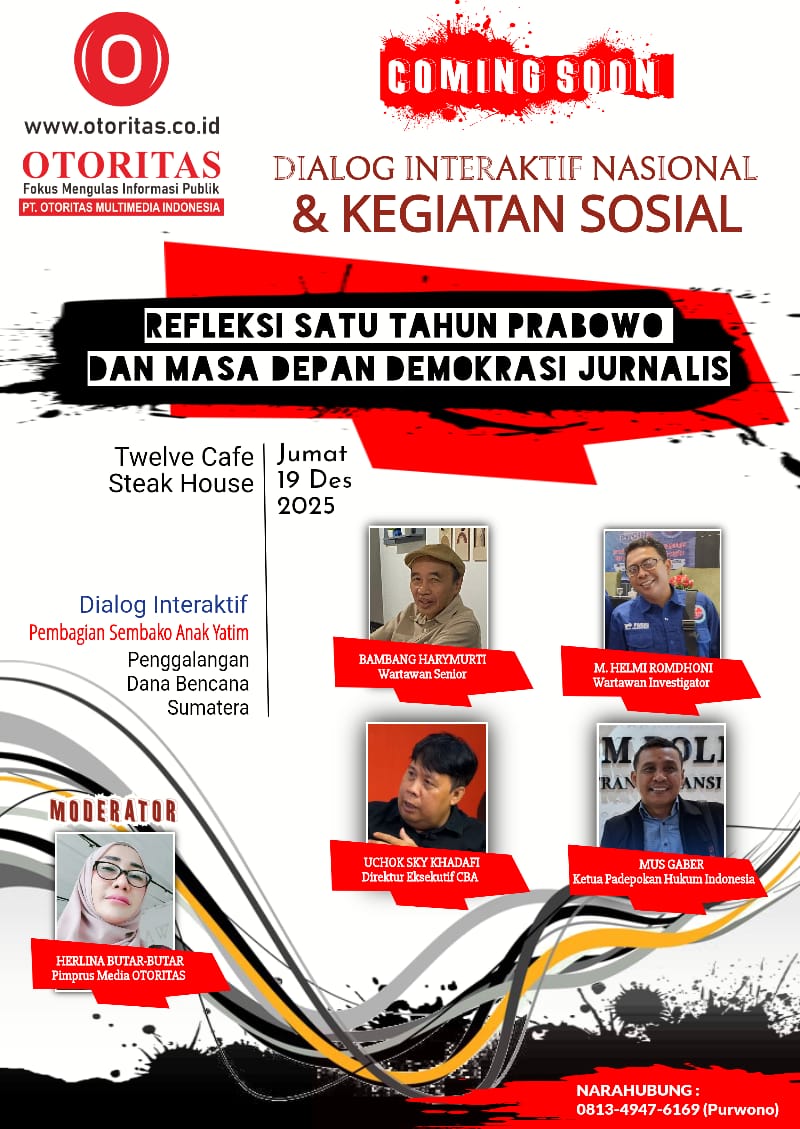 Jakarta, iTodayNews.id — Media Otoritas akan menggelar Dialog Interaktif Nasional dan Kegiatan Sosial pada Jumat, 19 Desember 2025, bertempat di Twelve Cafe Steak House, Jakarta. Acara ini mengusung tema “Refleksi Satu Tahun Prabowo dan Masa Depan Demokrasi Jurnalis”, sebagai ruang evaluasi publik terhadap arah demokrasi dan kebebasan pers di tahun pertama pemerintahan.
